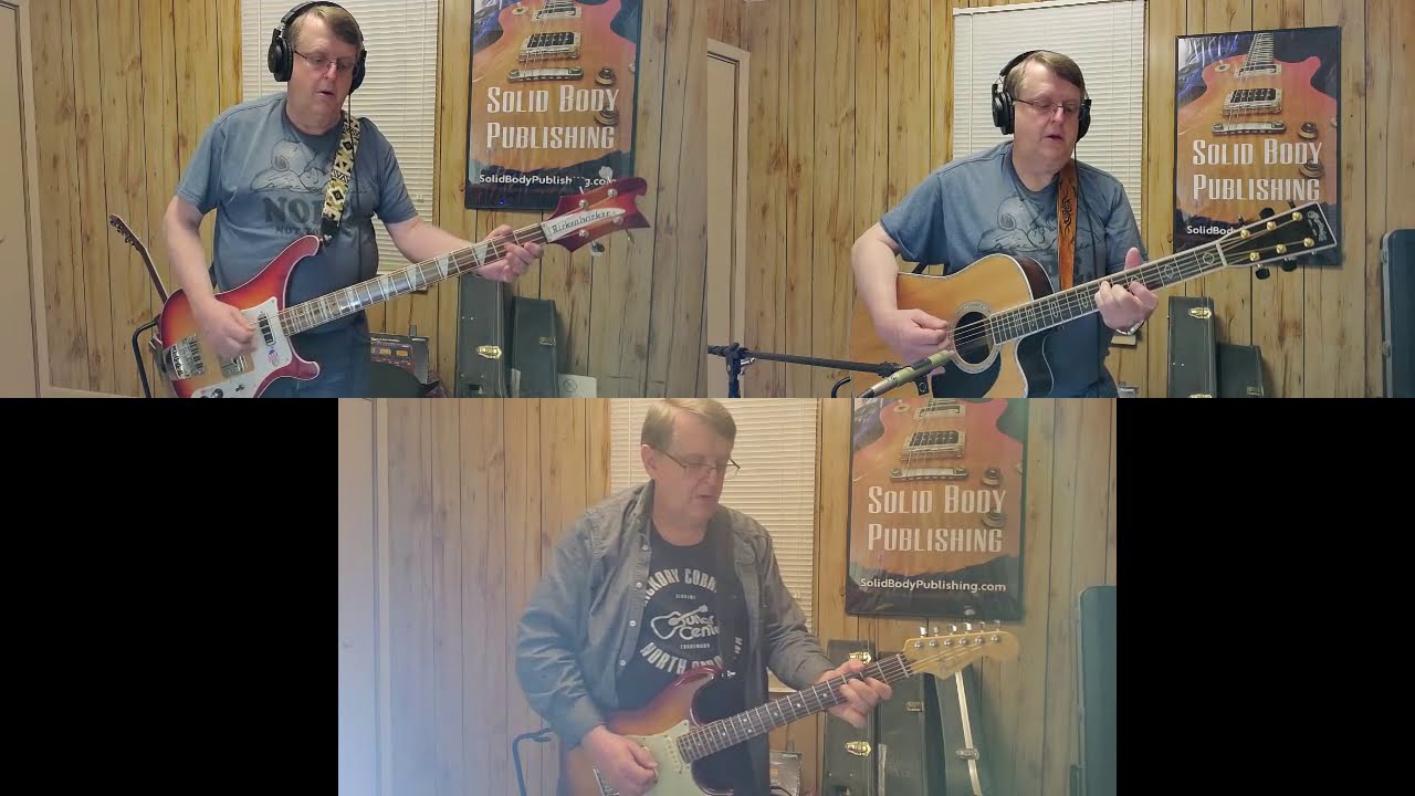 The Strat is in Drop D tuning, as was the Rickenbacker bass. The Martin was in DADGAD tuning. The BeatBuddy drum track was “Ballad 9 -16th” set to 90 BPM.
